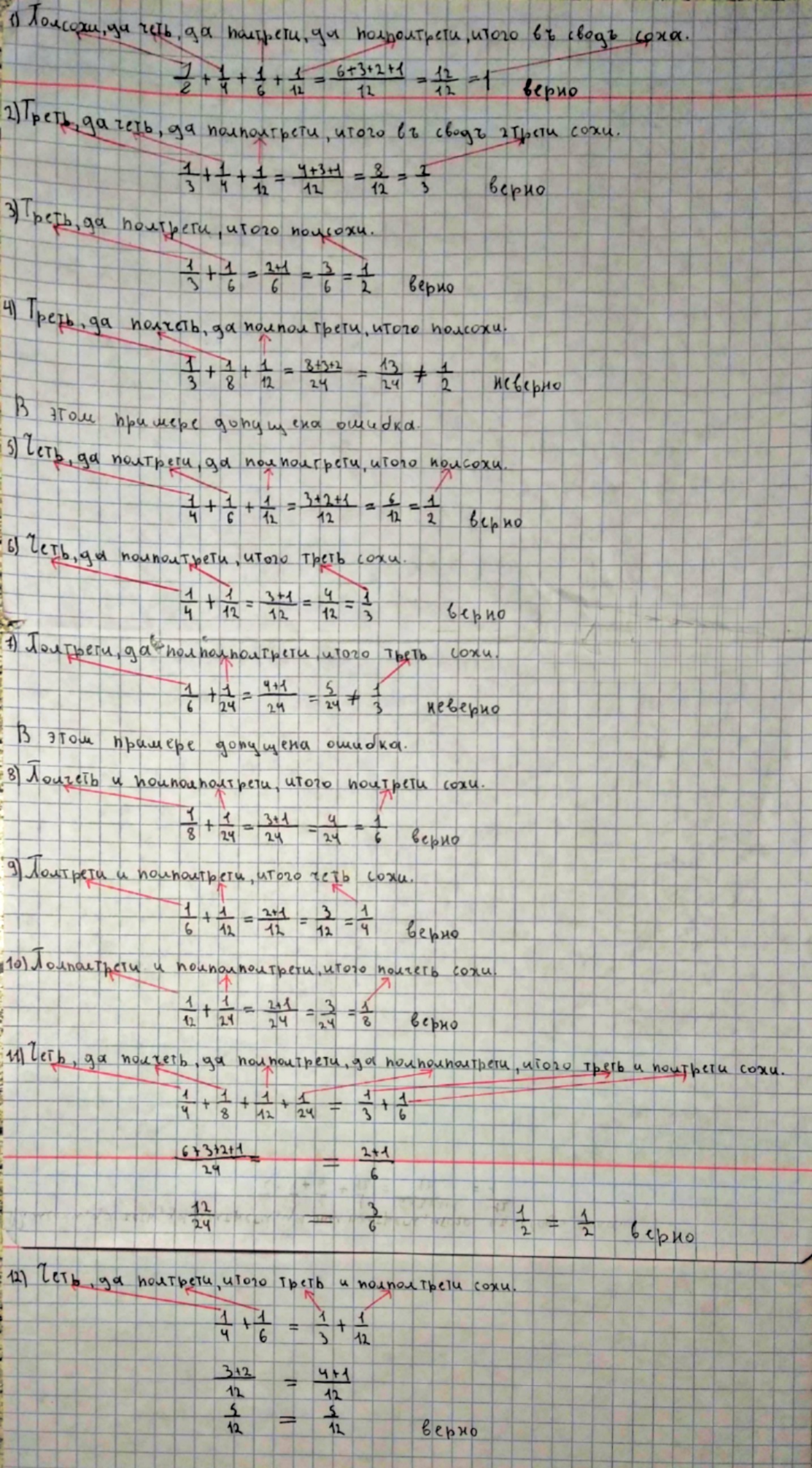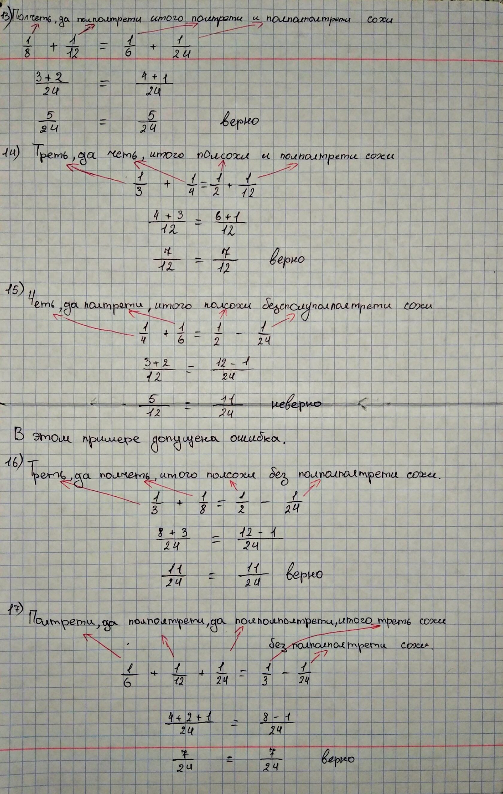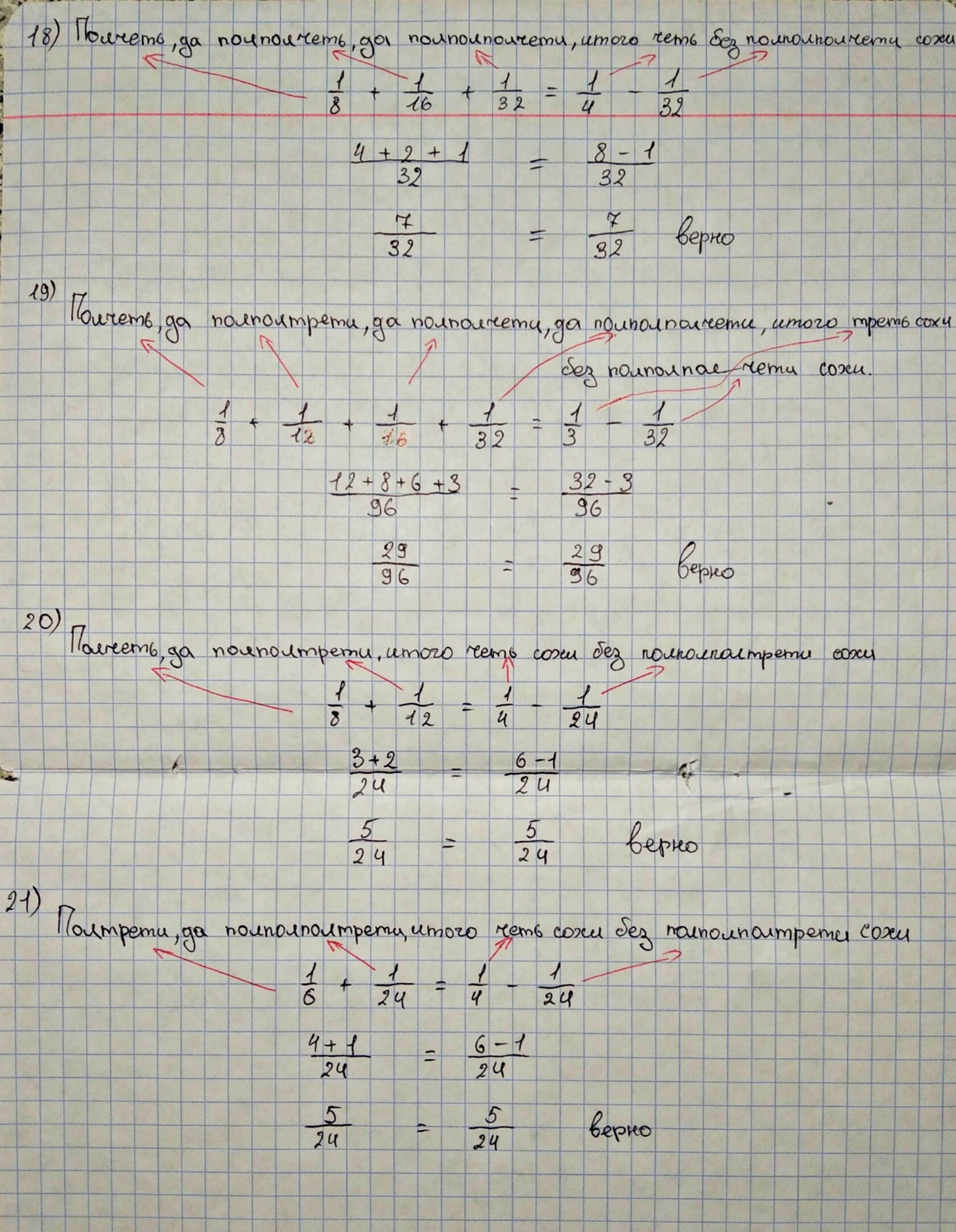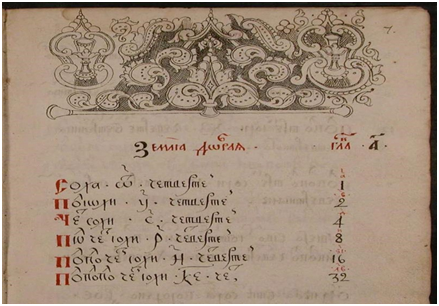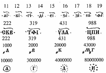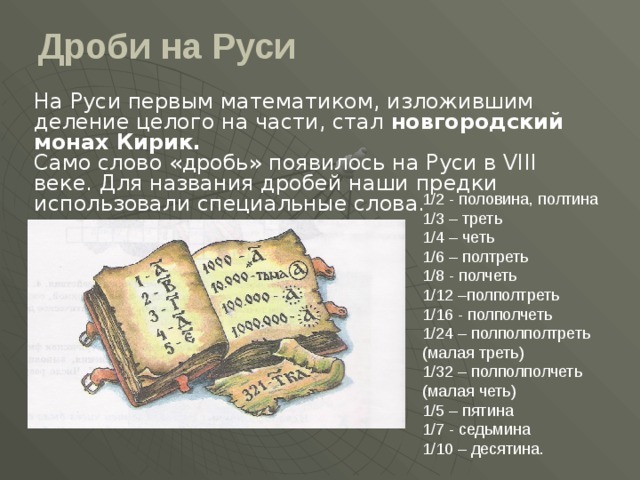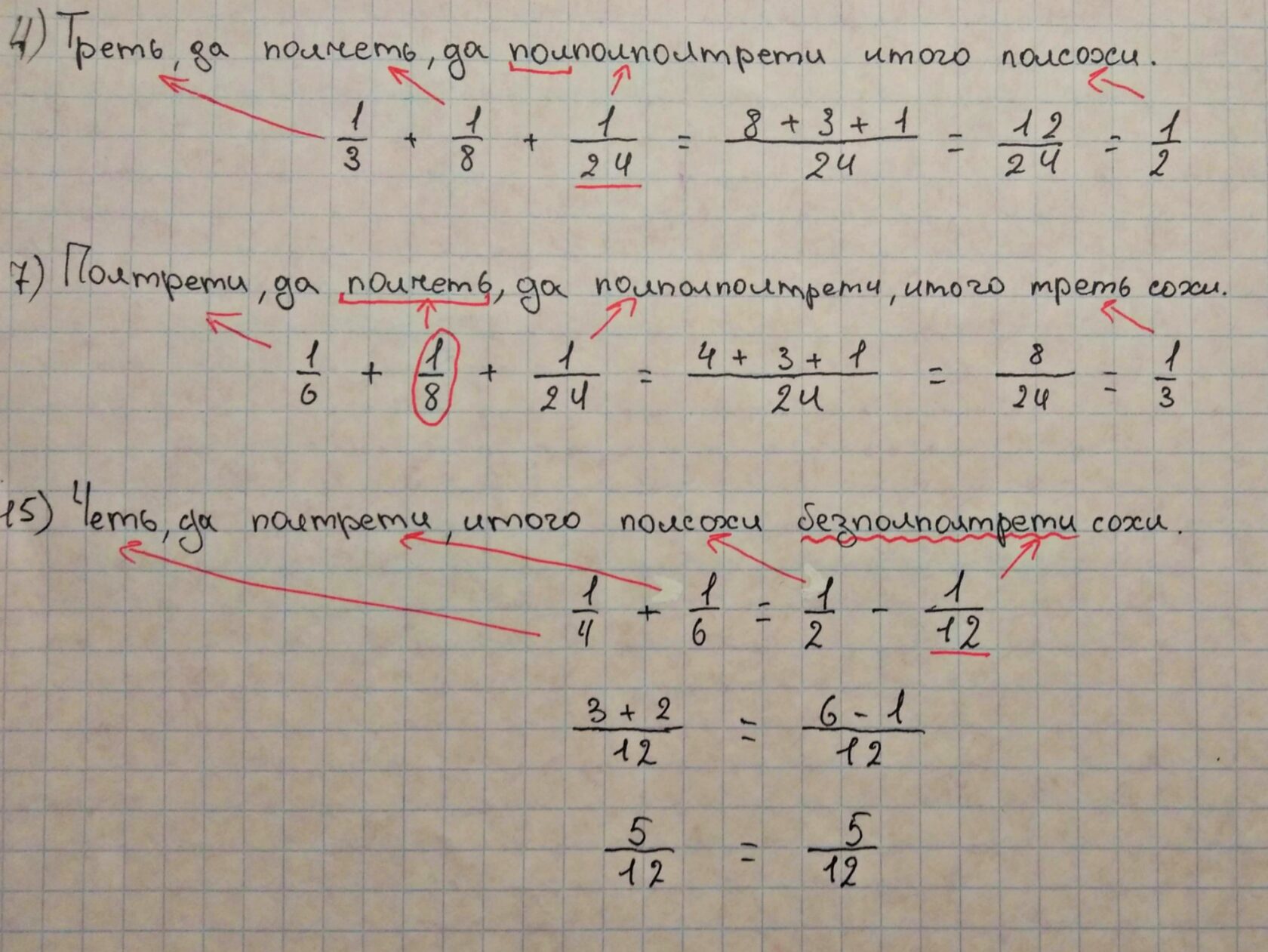 Надо иметь в виду также, что часто в древнерусских источниках дроби выражаются посредством сложения и вычитания. Например, 11/24 = треть (1/3) и пол-пол-трети (+ 1/12) и пол-пол-пол-трети (+ 1/24). Или 29/96 = треть без пол-пол-пол-четверти (1/3 — 1/32).
